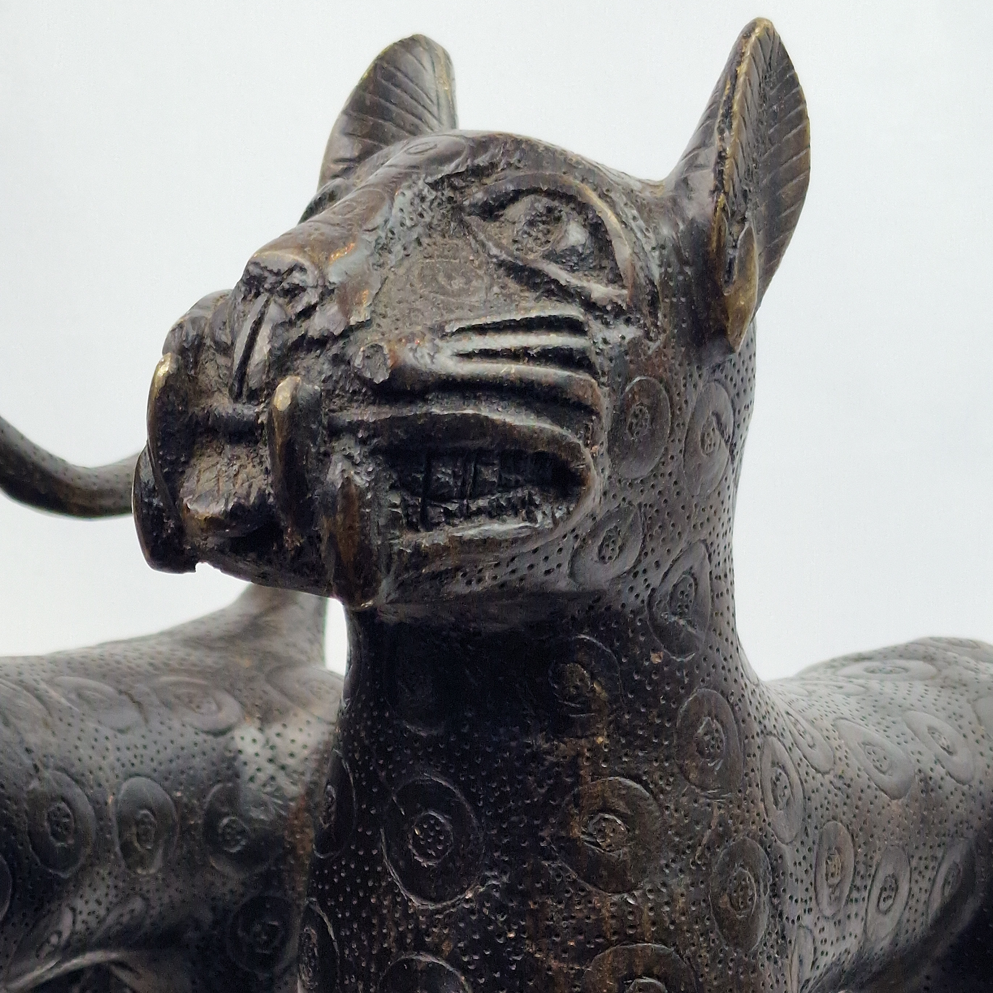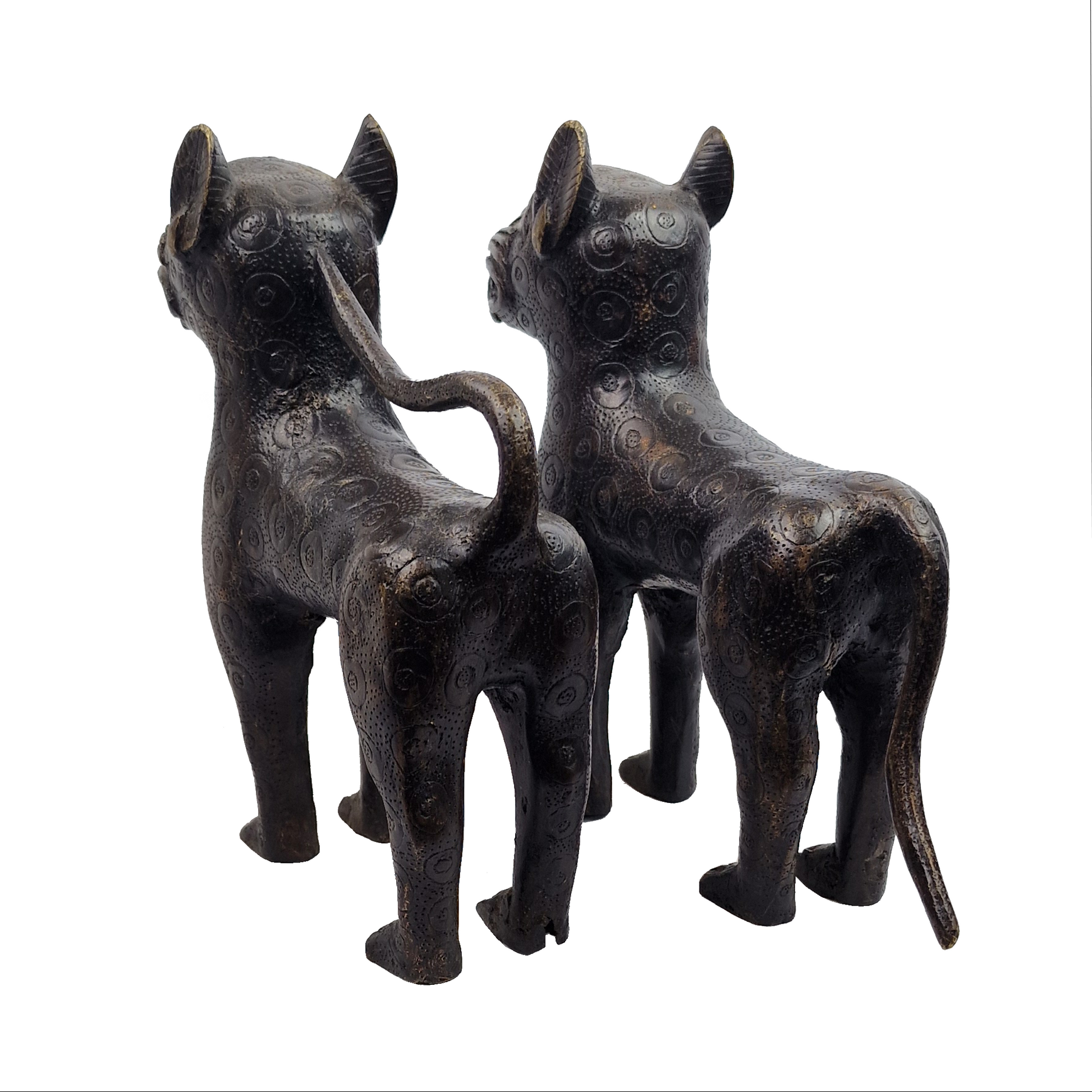 This rare and stunning pair of Benin Bronze Cat replicas stands at around 23cm tall and is about 23cm in length. The pair weigh around 3.4kg